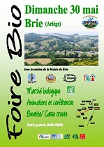 Le première édition de la Foire Bio à Brie, organisé par le Foyer Rural de Brie, se déroulera le dimanche 30 Mai 2010. Cet événement compte avec le partenariat des Croqueurs et Paysans Gourmands, le Civam Bio d’Ariège, la Mairie de Brie et l’Office de Tourisme le Foyer Rural de Brie.